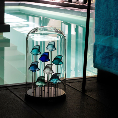 Perches, truites, cyprins, scalaires, harengs, sardines…les poissons qui ont inspiré René Lalique sont de taille, de morphologie et évoluent dans des environnements très différents. Ils ornent non seulement des bijoux, des boites, des vases, des surtouts, sont transformés en motifs décoratifs ou encore bouchons de radiateur… Mais le plus connu est certainement le cachet Poisson.