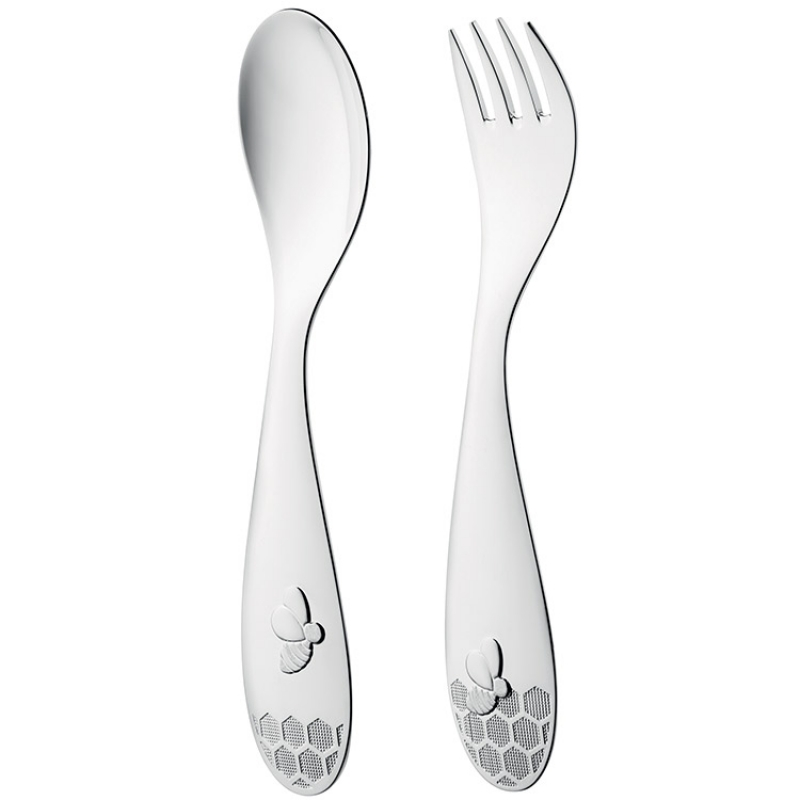 Le coffret de deux couverts contenant la fourchette et la cuillère charmera les tout petits. Emblématique de la collection, le décor imagé avec Beebee semblant voleter au-dessus de sa ruche est à la fois raffiné et ludique. La petite abeille en relief et les hexagones granités éveilleront les sens de bébé lors de ses repas au quotidien. Cet ensemble de couverts pourra faire l’objet d’un joli cadeau tout au long de la vie de l’enfant : naissance, baptême, anniversaire. La date de naissance, le prénom ou les initiales de l’enfant peuvent être gravés sur les couverts. Les couverts sont livrés dans leur écrin.