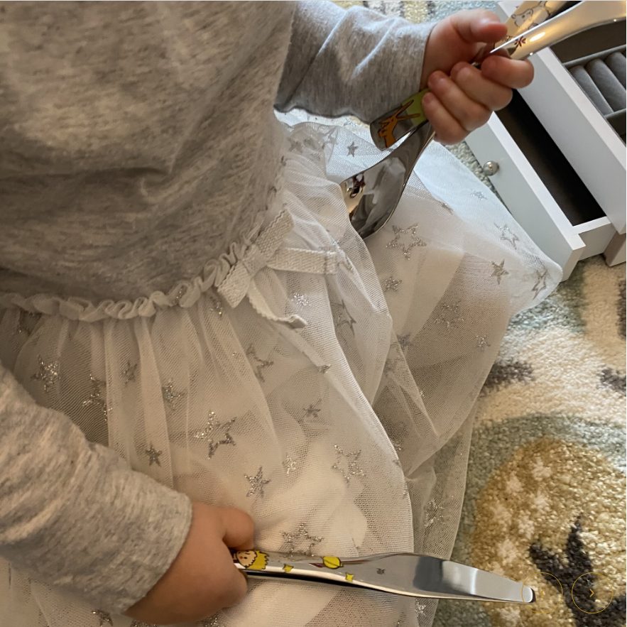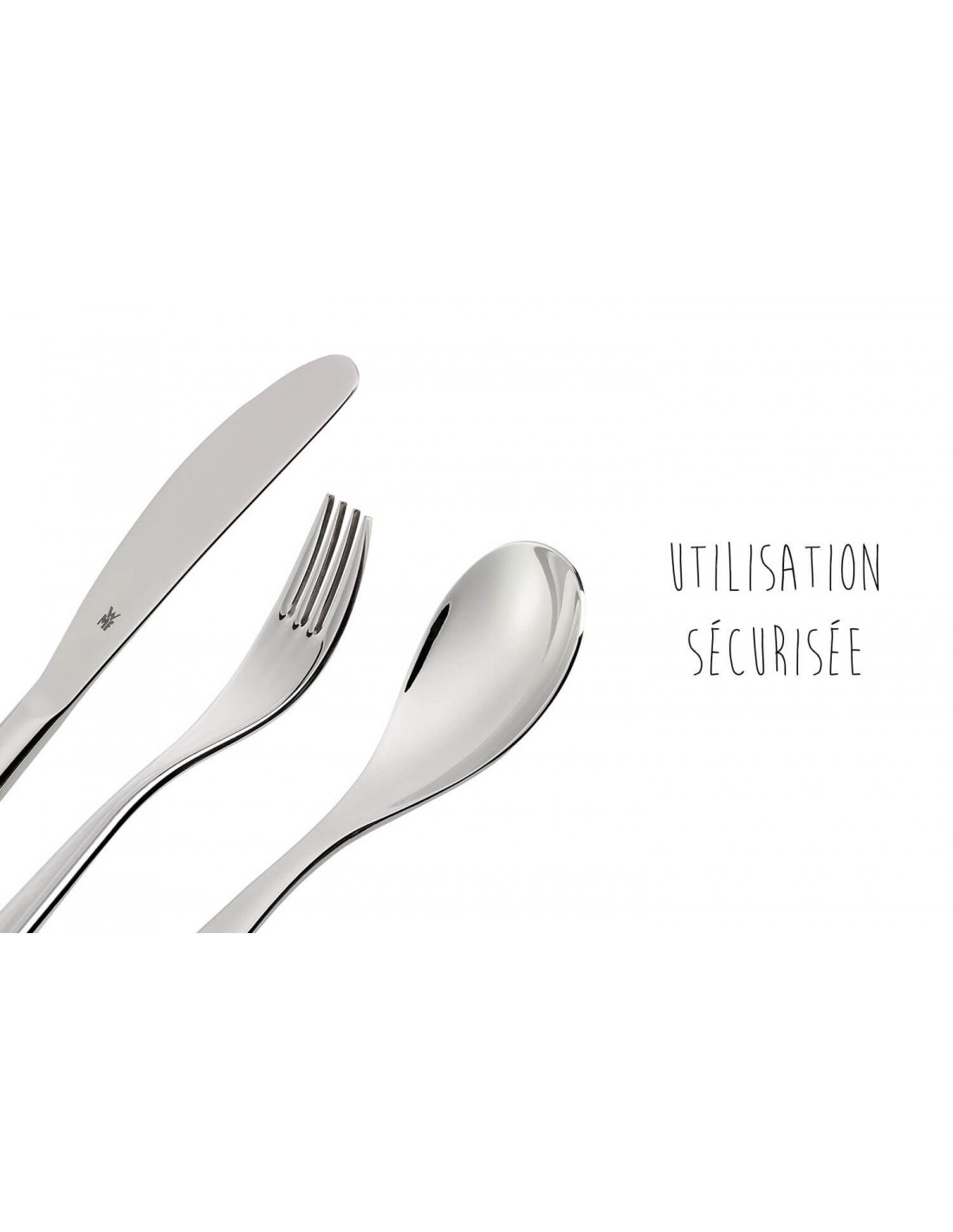 L’ergonomie des couverts offre une sécurité renforcée à vos enfants : la lame du couteau est peu crantée, les arêtes des cuillères sont arrondies et les dents de la fourchette sont émoussées.