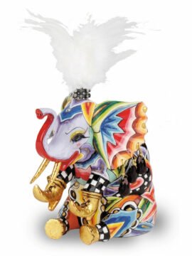 L’éléphant « Jumbo (S) » est un véritable Tom’s Drag. L’animal, symbole de bonne chance et de longue vie, porte un costume fantastique rempli d’ornements exotiques ludiques et brille dans les couleurs de l’arc-en-ciel. Avec son chapeau à plumes décoratif, il est paré comme pour un défilé de carnaval.