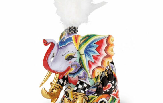 L’éléphant « Jumbo (S) » est un véritable Tom’s Drag. L’animal, symbole de bonne chance et de longue vie, porte un costume fantastique rempli d’ornements exotiques ludiques et brille dans les couleurs de l’arc-en-ciel. Avec son chapeau à plumes décoratif, il est paré comme pour un défilé de carnaval.