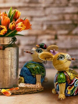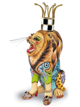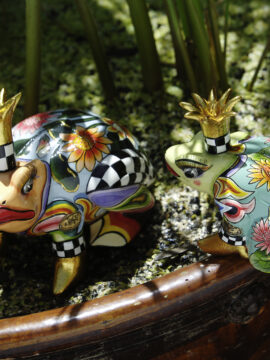 Comme tout les objets design de la collection Tom’s Drag, ces sculptures rayonnent de multiples couleurs et dorures qui leur donnent vie.