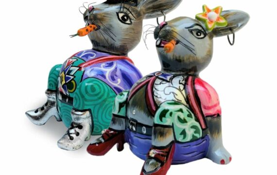 Lapins colorés mangeurs de carottes de la collection Toms Drags Printemps 2023. Les petits lapins assis portent un bonnet, des boucles d’oreilles et des bottes dorées. Fabriqué à la main en marmorin.